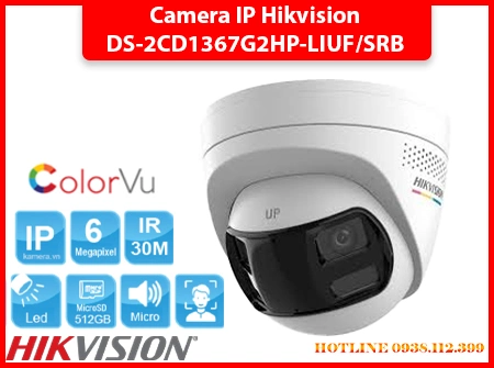 Camera ColorVu DS-2CD1367G2HP-LIUF/SRB ghi hình màu 24/7 với độ phân giải 6MP sắc nét, góc nhìn siêu rộng 180°, hỗ trợ đèn hồng ngoại và ánh sáng trắng tầm xa 30m. Tích hợp micro, loa, khe thẻ nhớ đến 512GB, đèn cảnh báo xanh đỏ và chống nước IP67, thích hợp giám sát ngoài trời hiệu quả.